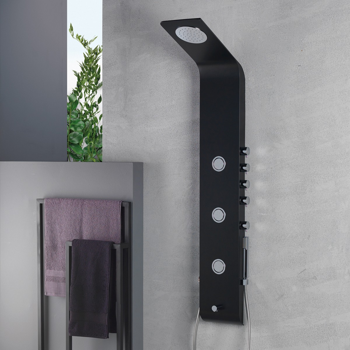ΣΗΛΗ ΝΤΟΥΣ LETE BLACK MATT υδρομασάζ θερμομικτική 4 εξόδων, από μασίφ αλουμίνιο.Έξοδοι:ντους κεφαλής ‘anticalcare’,3 jet υδρομασάζ κατευθυνόμενα ‘anticalcare’,στόμιο πλύσης ποδιών,τηλέφωνο ντους ‘anticalcare’